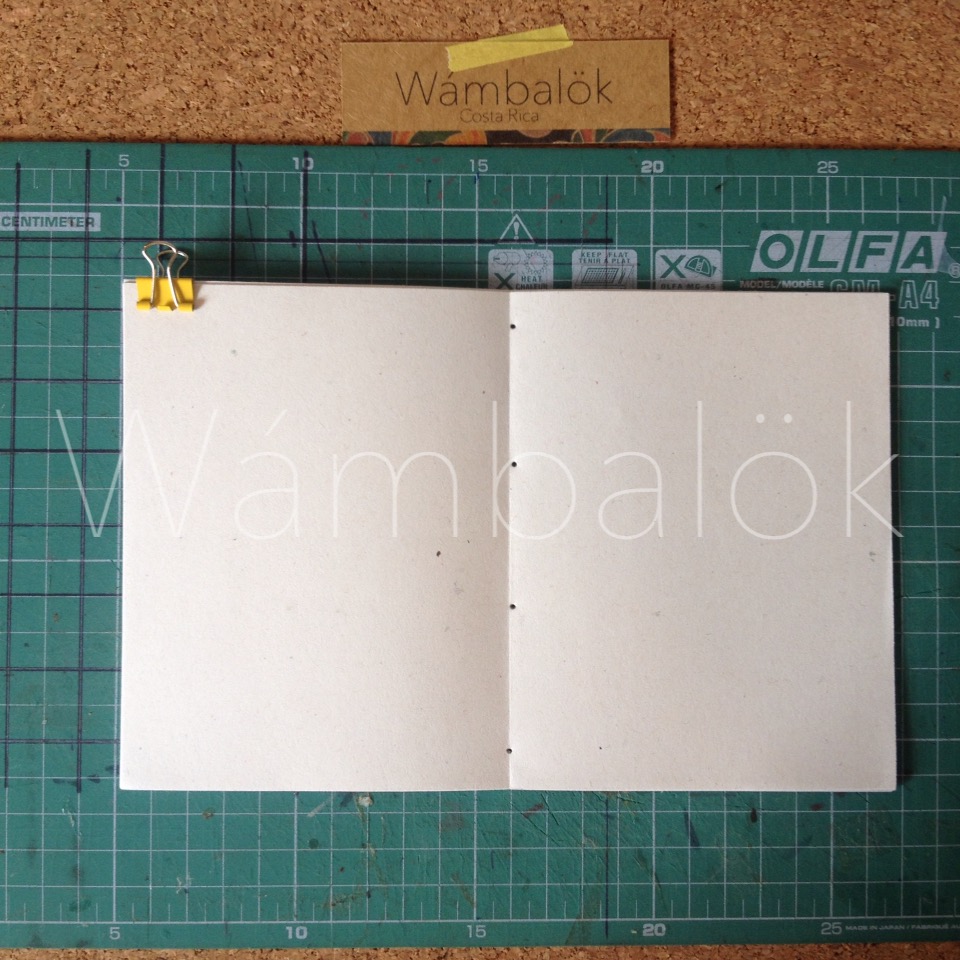 Ahora con algún objeto hacemos 5 huecos a la mitad de las hojas y la portada, acá es donde vamos a pasar las puntadas para unir el cuaderno. Mi cuaderno midió 14 cm de ancho, entonces hice dos huecos a cada lado separados a 1cm del borde, luego con dos separaciones de 4cm y finalmente una de 2cm al centro.