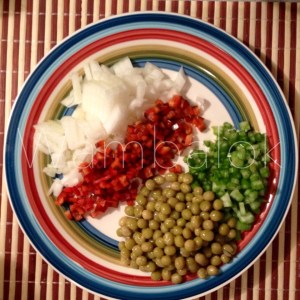 Esperando que esté todo listo, picamos la media cebolla y el chile que nos queda, el apio y le quitamos el exceso de agua a los petit pois y apartamos para preparar luego el pollo.
