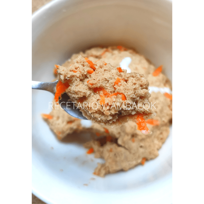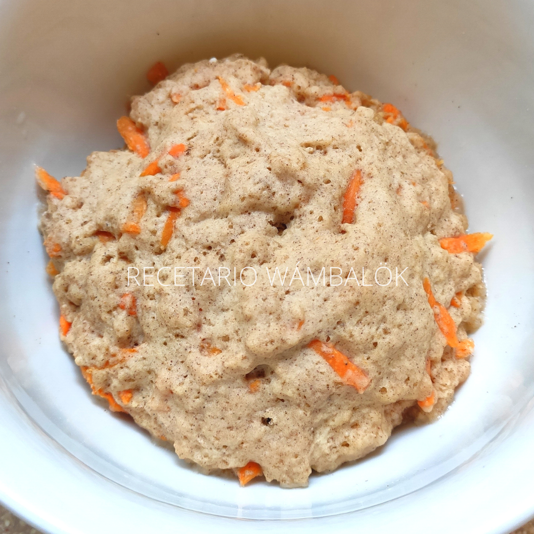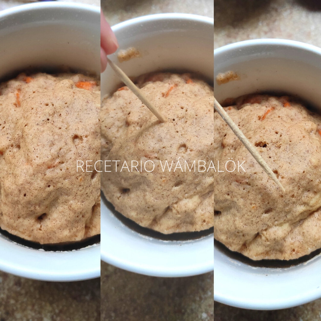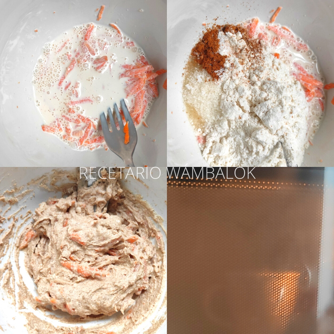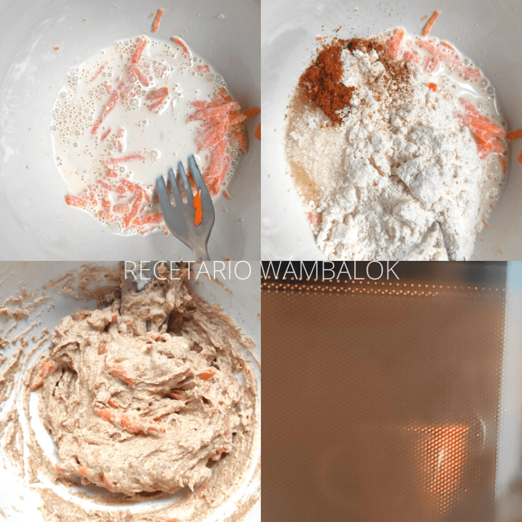Tomamos un recipiente apto para microondas, puede ser una taza o un bowl, y le colocamos un “spray” de aceite o mantequilla; agregamos la mezcla y horneamos por 2 minutos en el micro.