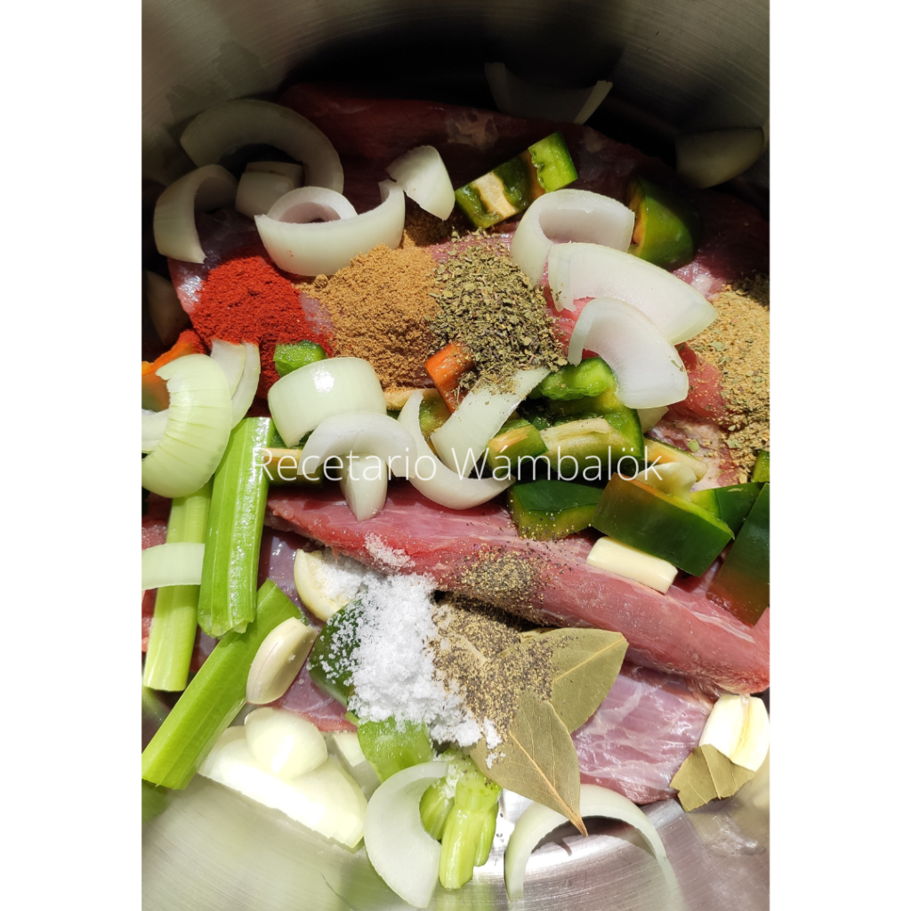 Primero prepararemos la carne, picamos de manera gruesa uno de los chiles (o la mitad), cebolla, apio, 2 ajos. En una olla agregamos la cucharadita de orégano, paprika, sazón completa, las hojitas de laurel, sal-pimienta al gusto, la carne y los olores frescos; cubrimos con agua hasta cubrir la carne, tapamos y colocamos a fuego medio bajo hasta que la carne esté suave, alrededor de 45-50 minutos en una olla normal. Si llegara a perder líquido, se le puede agregar más agua caliente.