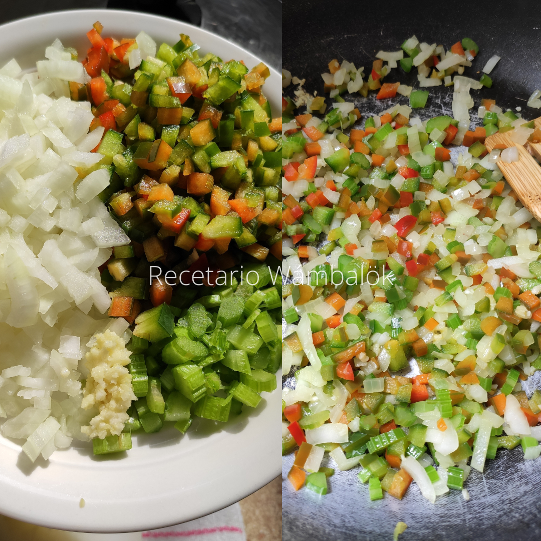 Mientras esta enfría picamos finamente el otro chile (o la mitad de la que ya utilizamos), cebolla, apio, 2 ajos y sofreímos en un sartén.