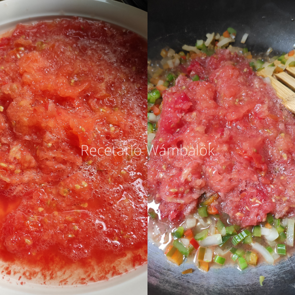 Con ayuda del rallador, en la cara de corte grueso, rallamos los dos tomates e incorporamos al sofrito cuando ya la cebolla esté cristalizada. Bajamos el fuego al mínimo y dejamos que todo se integre.