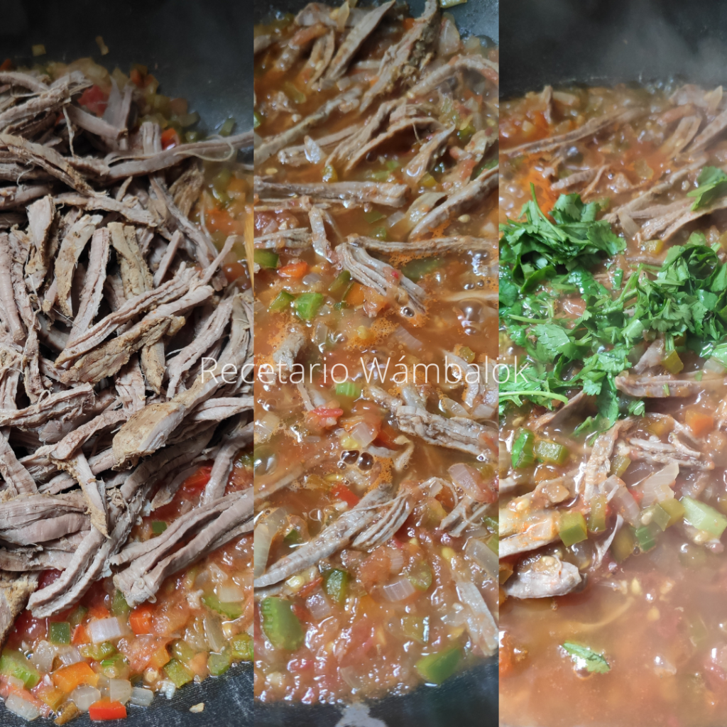 Para mechar la carne es más sencillo hacerlo a mano y como ya está fría es mucho más fácil, deshilachar hebra por hebra hasta terminar con toda la pieza. Listo esto, agregamos al sofrito con tomate, también agregamos una taza del caldo donde preparamos la carne y subimos la temperatura del fuego y mezclamos.