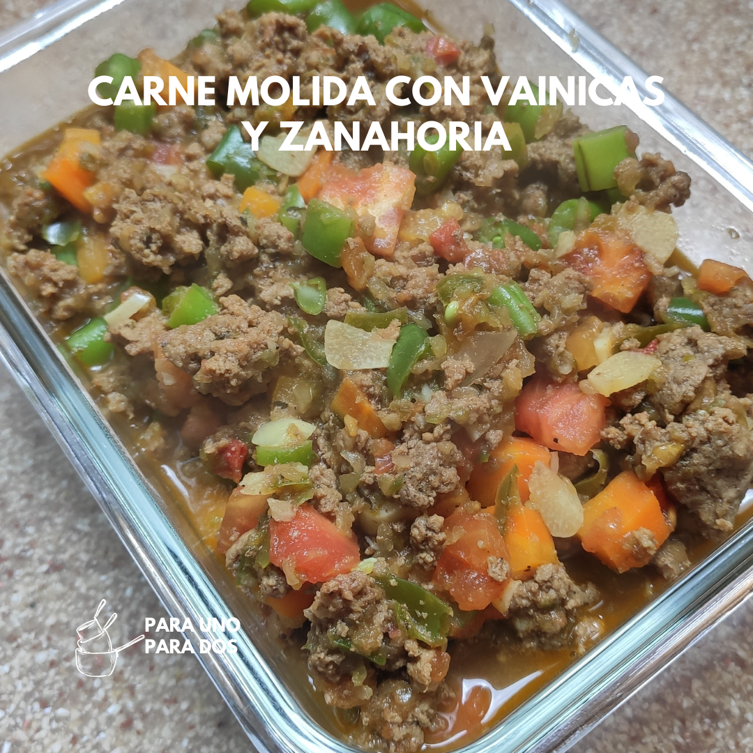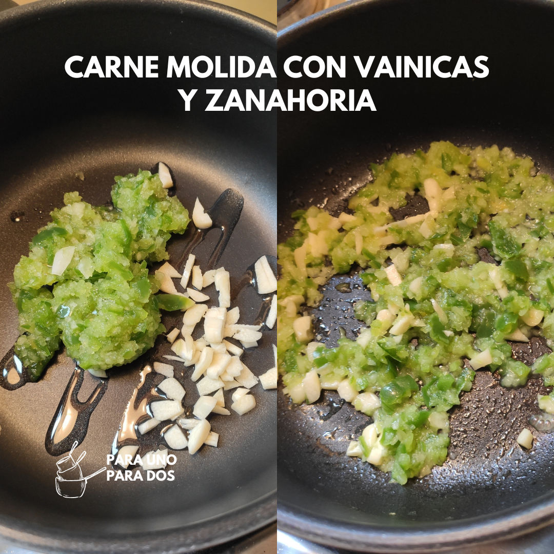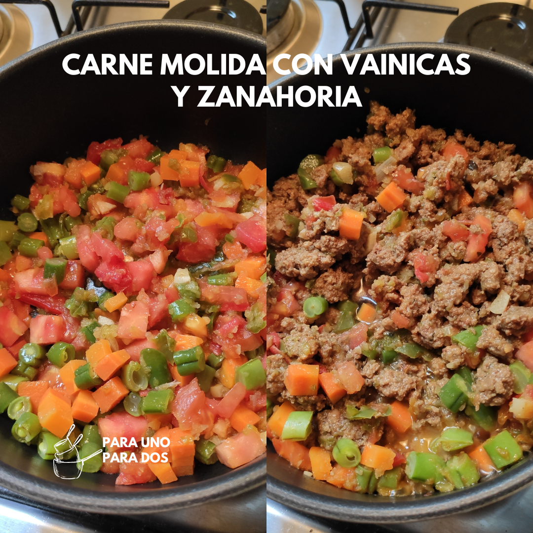 Una vez listo este paso, agregamos las vainicas, las zanahorias y el tomate, mezclamos hasta integrar bien. Seguidamente agregamos la carne molida base, volvemos a mezclar hasta integrar. Si notamos que está un poco seca la preparación, podemos agregar de una en una cucharadas de agua o caldo, lo que tengamos disponible. Probamos punto de sal y condimentos y ajustamos si es necesario. ¡Mucho cuidado con la sal! Como ya la carne estaba preparada, no debe necesitar mucha más sal o condimentos.