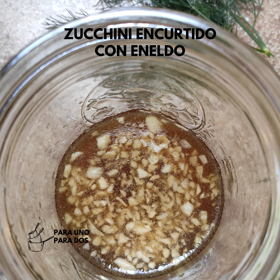 En el recipiente, agregamos el vinagre, la sal, tapa de dulce, ajo y mezclamos hasta incorporar bien todos los ingredientes. Sobre esta mezcla vamos agregando los zucchinis bien acomodados e intercalando con el eneldo, hasta terminar con el zucchini.