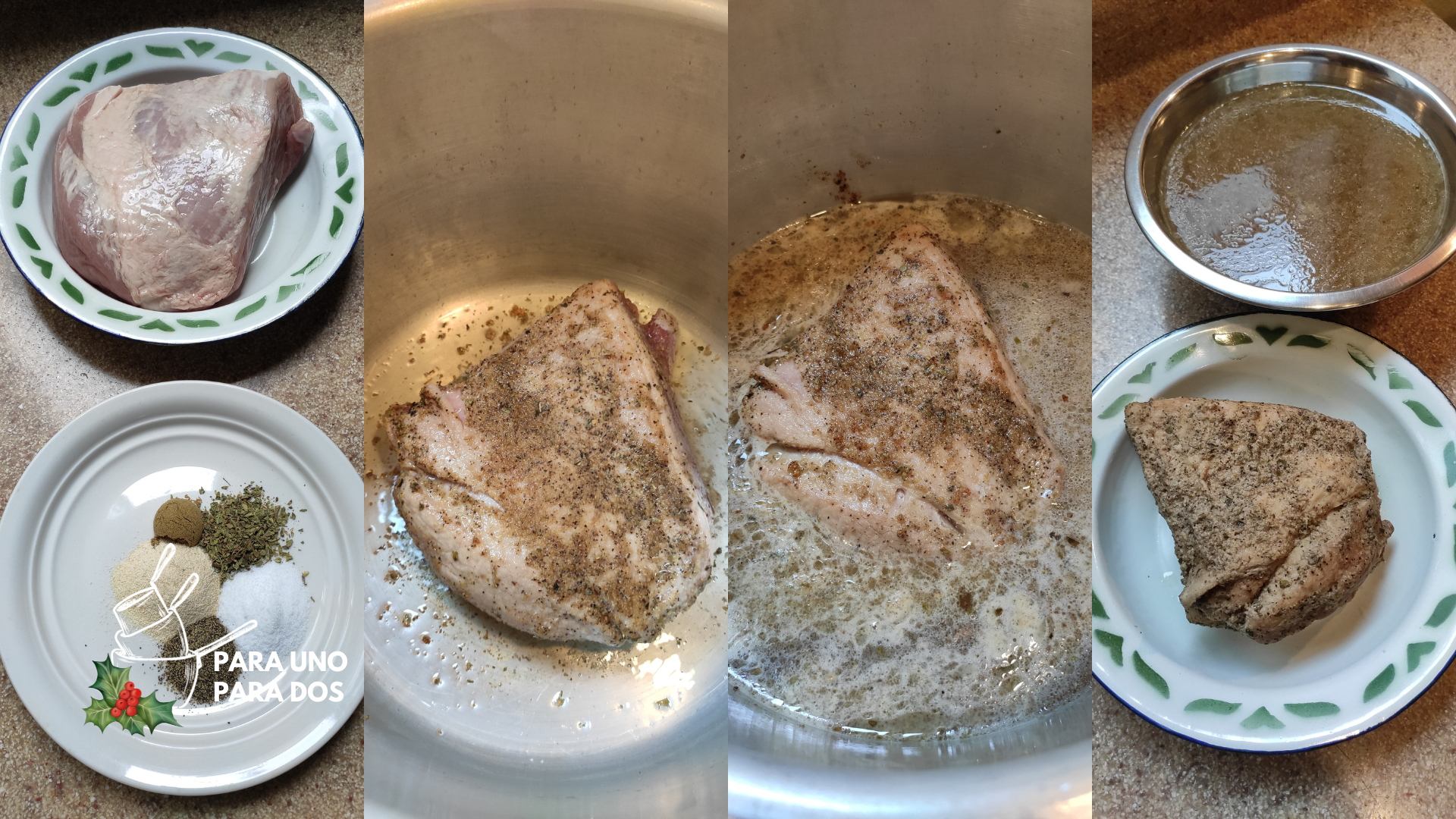Mezclar todos los condimentos secos y frotarlos bien en la posta de cerdo. En la olla colocar 1 cucharada de mantenca de cerdo, calentar y cuando ya esté a punto; colocar la carne y sellar por todos sus lados. Hecho esto, agregar las 6 tazas de agua tibia/caliente, es mejor agua tibia/caliente para que no hayan cambios bruscos de temperatura en la preparación que ya tenemos en curso. Tapar, asegurar bien la olla y cocinar 40 minutos a fuego medio bajo, después del primer hervor o pitido de la olla. Una vez listo, retirar la carne y ponerla a que pierda un poco de calor, cuando ya esté a una temperatura manejable, cortamos trozos de 2cmx2cm o al gusto, reservamos. Con el apoyo de un colador colamos el líquido de la cocción, medimos las 3 ½ tazas y reservamos.