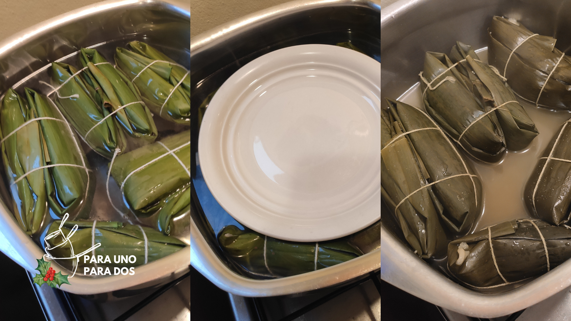 Mientras vamos formando los tamales, podemos ir calentando el agua a fuego medio, en una olla de buena capacidad colocamos las piñas de tamal “acostadas” en el fondo de la olla, con agua suficiente para tapar los tamales. Si vemos que los tamales podrían flotar, les podemos poner encima un plato de cerámica para que no se muevan mucho durante la cocción. Nosotros utilizamos dos ollas, una grande y una mediana, para cocinar nuestros tamales. Cuando ya la olla comience a hervir, cocinamos por 45 minutos.