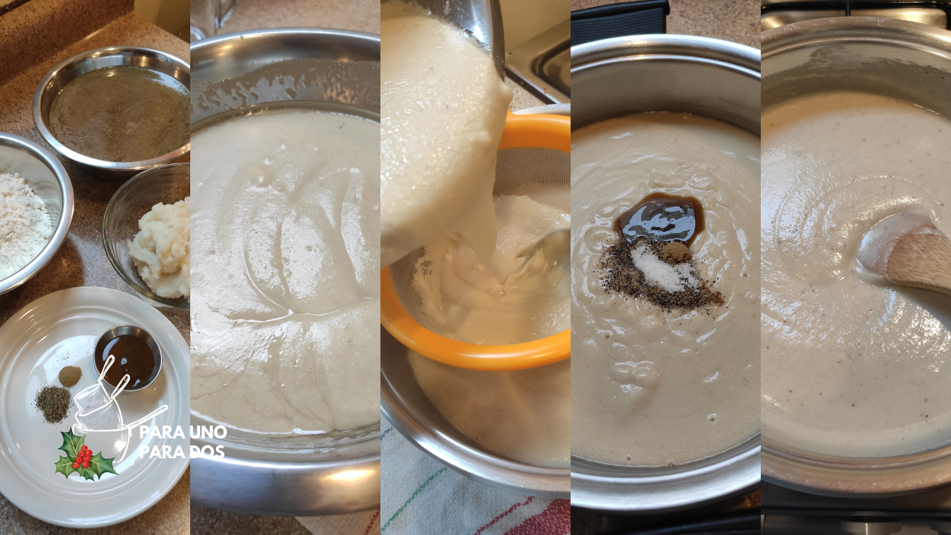 Con el apoyo de un globo o un tenedor, mezclamos hasta integrar, deshaciendo bien los grumos que se vayan formando, agregar lo que queda del caldo e incorporar bien, esta preparación queda líquida. Añadimos el puré tibio y la manteca de cerdo, mezclamos hasta integrar, deshaciendo bien los grumos que se vayan formando. Listo esto, colamos en un colador grande, lo agregamos a una olla y agregamos los condimentos restantes.