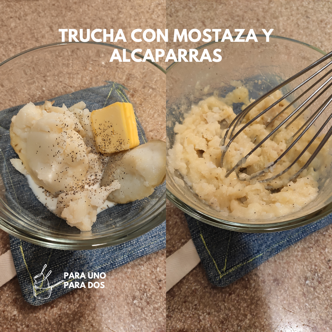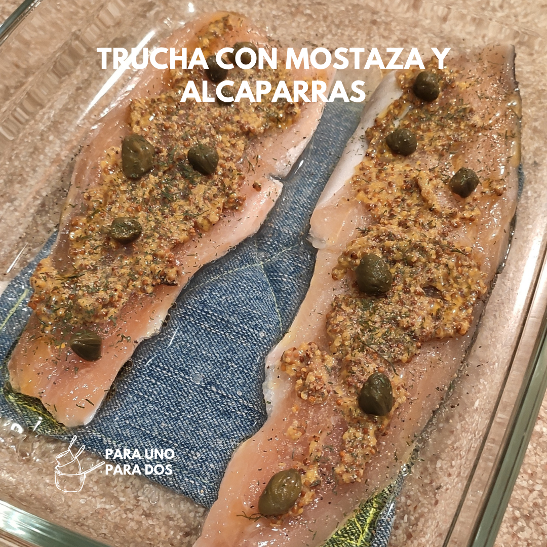 En un recipiente apto para microondas colocamos los filetes de trucha, a cada pieza individual le añadimos la mostaza, alcaparras, eneldo, aceite de oliva y el jugo de limón. Cocinamos por 4 minutos en el microondas. Como son piezas delgadas, no requieren mucho tiempo en el micro y quedan perfectamente cocidas.