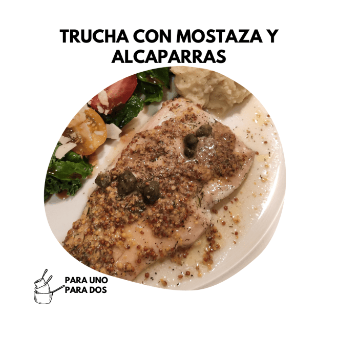 En un recipiente apto para microondas colocamos los filetes de trucha, a cada pieza individual le añadimos la mostaza, alcaparras, eneldo, aceite de oliva y el jugo de limón. Cocinamos por 4 minutos en el microondas. Como son piezas delgadas, no requieren mucho tiempo en el micro y quedan perfectamente cocidas.