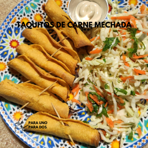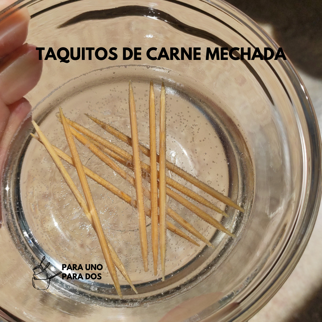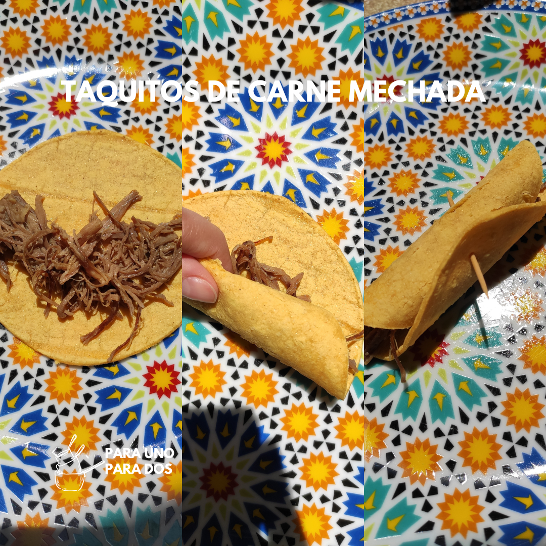 Mientras tanto, tomamos una tortilla, rellenamos con carne y hacemos un rollito/taquito, insertamos un palito de dientes para evitar que se abra la tortilla. Repetimos este procedimiento con las demás tortillas y relleno.