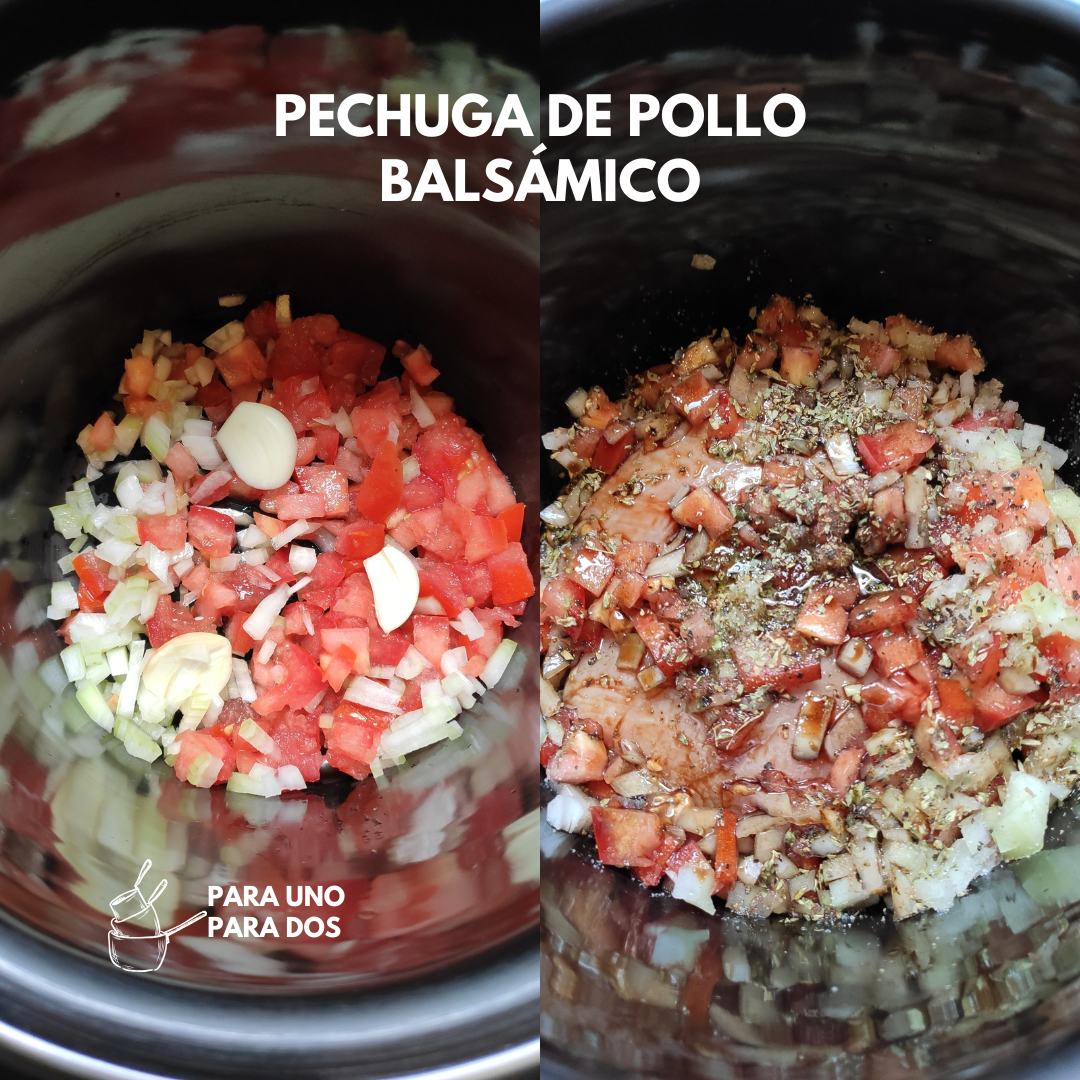 A la olla de cocimiento lento agregamos la mitad de la cebolla, el tomate, y unos ajos; seguidamente la pechuga de pollo y el resto de los ingredientes. Colocamos la tapa y cocinamos por 3 horas en HIGH o 6 en LOW.