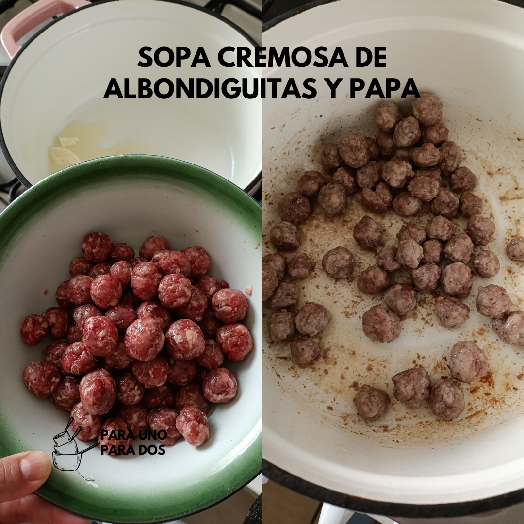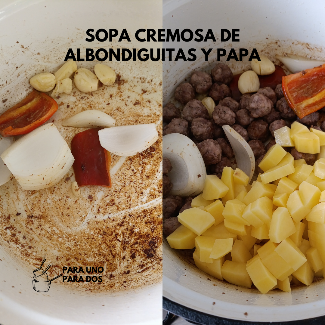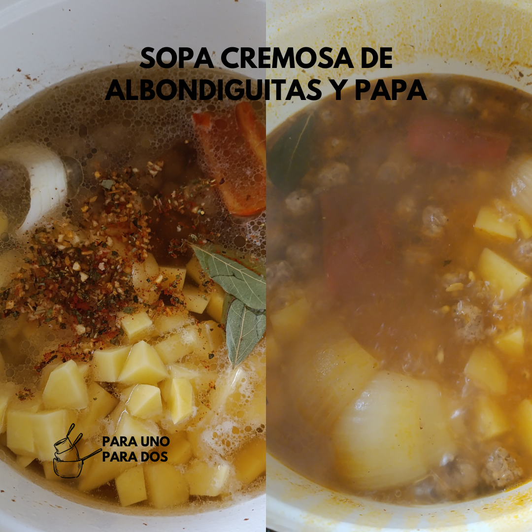 Las retiramos de la olla y reservamos. Agregamos la cebolla, chile y ajos para sofreír un poco, volvemos a incorporar las albondiguitas, la papa, agua y condimentos; últimamente me gusta mucho una sazón completa con achiote de una tienda a granel. Llevamos a hervir a fuego medio, por 30 minutos o hasta que la papa esté bien cocida.