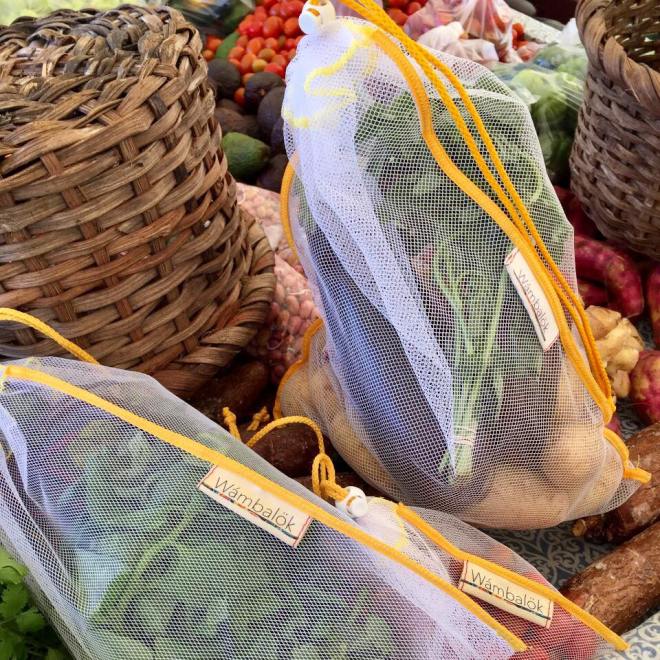 Las Bolsas Reutilizables Multiusos Wámbalök están confeccionadas en una malla de 100% poliéster, duradera y resistente lo que aporta inocuidad a los alimentos, u objetos, que se puedan almacenar en ellas. También aportan ventilación y frescura a las frutas o verduras almacenadas dentro de ellas en la refrigeradora, porque por medio de la malla, sale el etileno que producen. Por su versatilidad también pueden ser utilizadas para almacenar objetos de uso diario, juguetes, prendas de vestir, accesorios y demás, aportando ventilación para evitar olores y humedad.